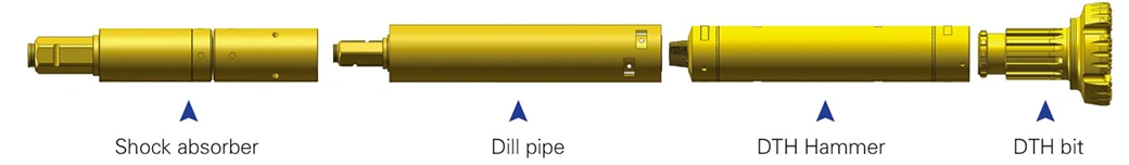 Les outils DTH grand diamètre sont composés d’un système intégré marteau + taillant, combiné à une foreuse rotative modifiée ou à une foreuse à tarière longue adaptée.